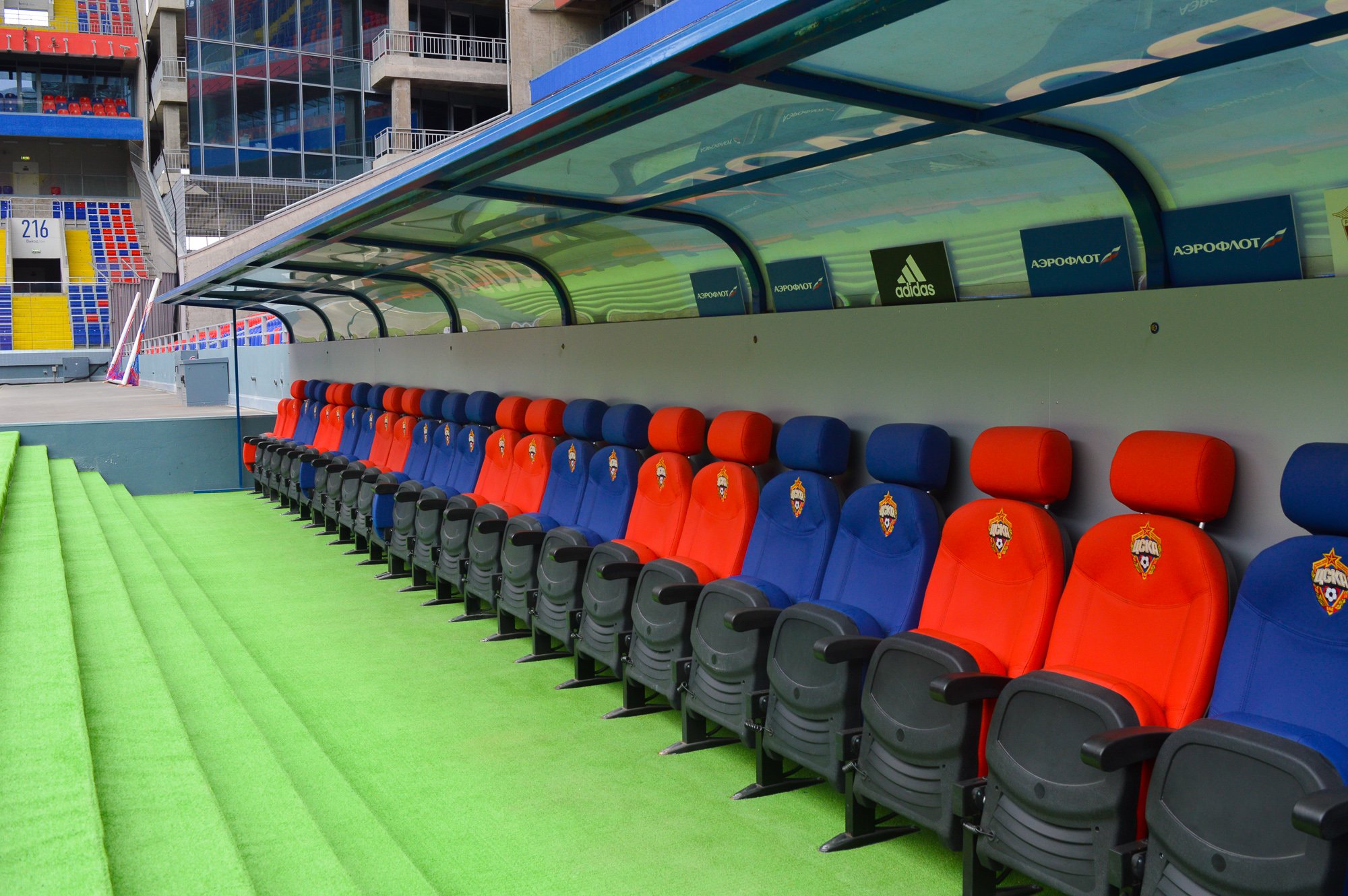 Если прогуляться вдоль поля, то можно посидеть в креслах, на которых во время матчей находятся тренеры и запасные игроки.